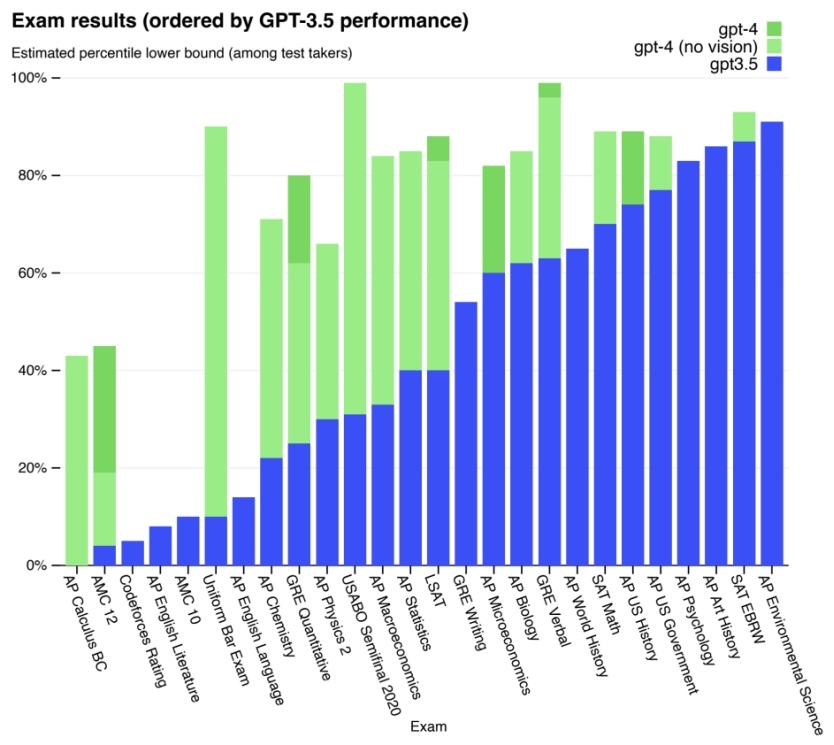 OpenAI conducted a comprehensive evaluation of GPT-4, not only against classic NLP benchmarks, but also against exams designed to evaluate humans (e.g. Bar exam, GRE, Leetcode).